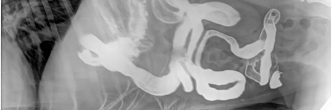 Z tego powodu wszelkie zmiany, które znajdują się w świetle przewodu pokarmowego lub w ścianie przeciwległej do wysyłanych przez sondę ultradźwięków, nie mogą być uwidocznione. Lekarz weterynarii dla uzupełnienia diagnostyki posługuje się obrazem rentgenowskim, czyli tzw. diagnostyką cieni. Do powstawania obrazu RTG dochodzi poprzez pochłanianie promieni X przez tkanki. Ze względu na podobną gęstość radiologiczną wielu narządów jamy brzusznej, odczytanie tych cieni jest niezwykle trudne i często wymaga wykonania wielu projekcji. Nierzadko lekarz prowadzący decyduje o tzw. badaniu kontrastowym przewodu pokarmowego (fot. 13A–B), aby upewnić się, że jego drożność i praca są prawidłowe.