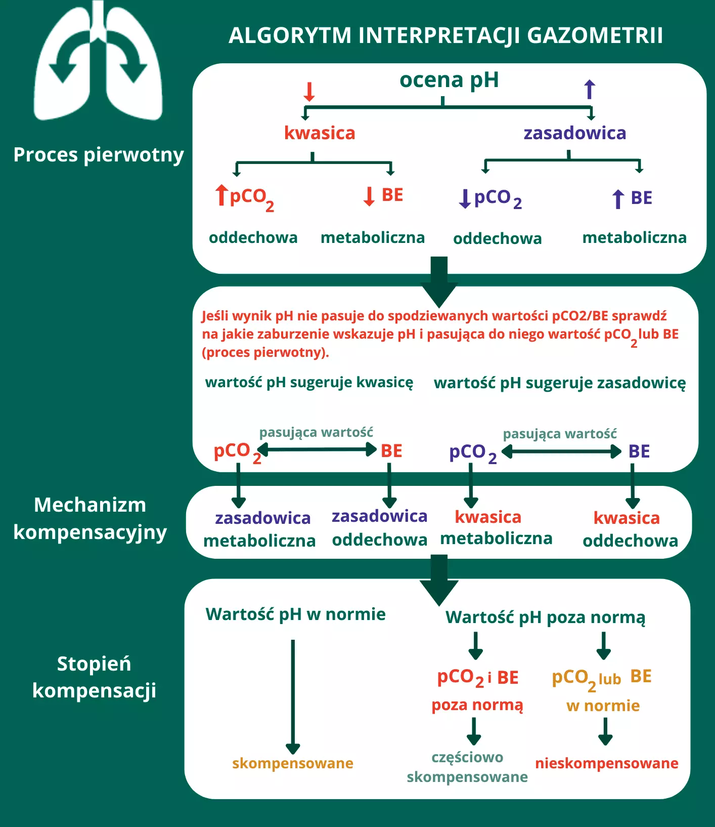Analizę wyników gazometrii rozpoczyna się od oceny pH krwi.