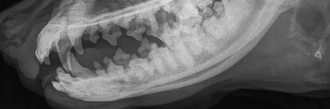 Wykonano zdjęcie rentgenograficzne (RTG) w projekcjach bocznej oraz strzałkowej (fot. 2 i 3). Radiogramy uwidoczniły mineralizację w okolicy odpowiadającej umiejscowieniu przewodu ślinianki przyusznej. Zwierzę poddano również sjalografii (fot. 4).
